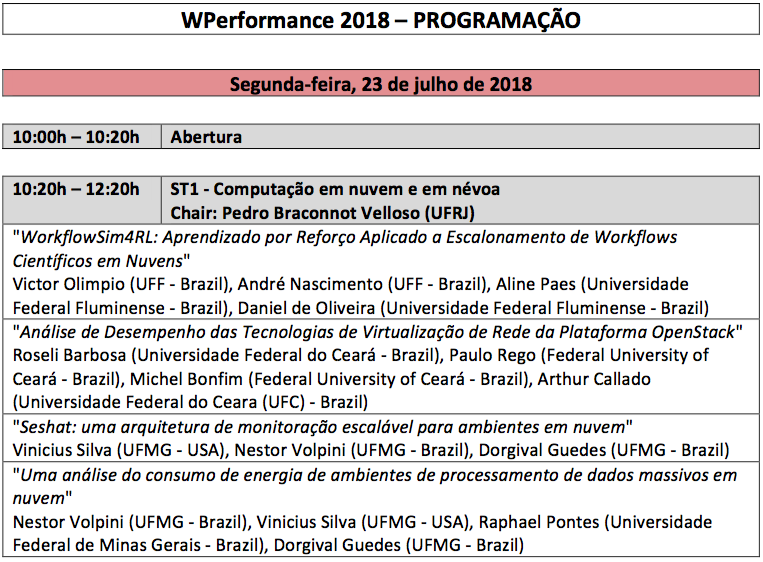 O Workshop em Desempenho de Sistemas Computacionais e de Comunicação, conhecido como WPerformance, é um fórum para discussão e disseminação de ideias sobre métodos, modelos, técnicas e ferramentas para avaliação de desempenho de sistemas computacionais e de comunicação. O WPerformance se propõe a receber artigos relacionados a problemas de desempenho das mais diversas áreas de hardware, software e aplicações da computação (por exemplo, redes de computadores, sistemas distribuídos, sistemas ciberfísicos, bancos de dados e sistemas operacionais).