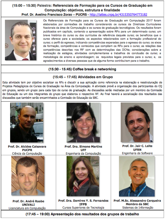 Durante o CQ 2018 serão abordados os Referenciais de Formação para os Cursos de Graduação em Computação (RFs) elaborados pela SBC com base nas Diretrizes Curriculares Nacionais para Cursos de Graduação na Área da Computação (DCNs). Para as apresentações foram convidados representantes dos comitês que elaboraram os referenciais e serão realizadas discussões sobre a elaboração de Projetos Pedagógicos de Cursos considerando as DCNs e os RFs. Constam também da programação palestras sobre o Instrumento de Avaliação de Cursos de Graduação do MEC/INEP e sobre Currículos e Projetos Pedagógicos.